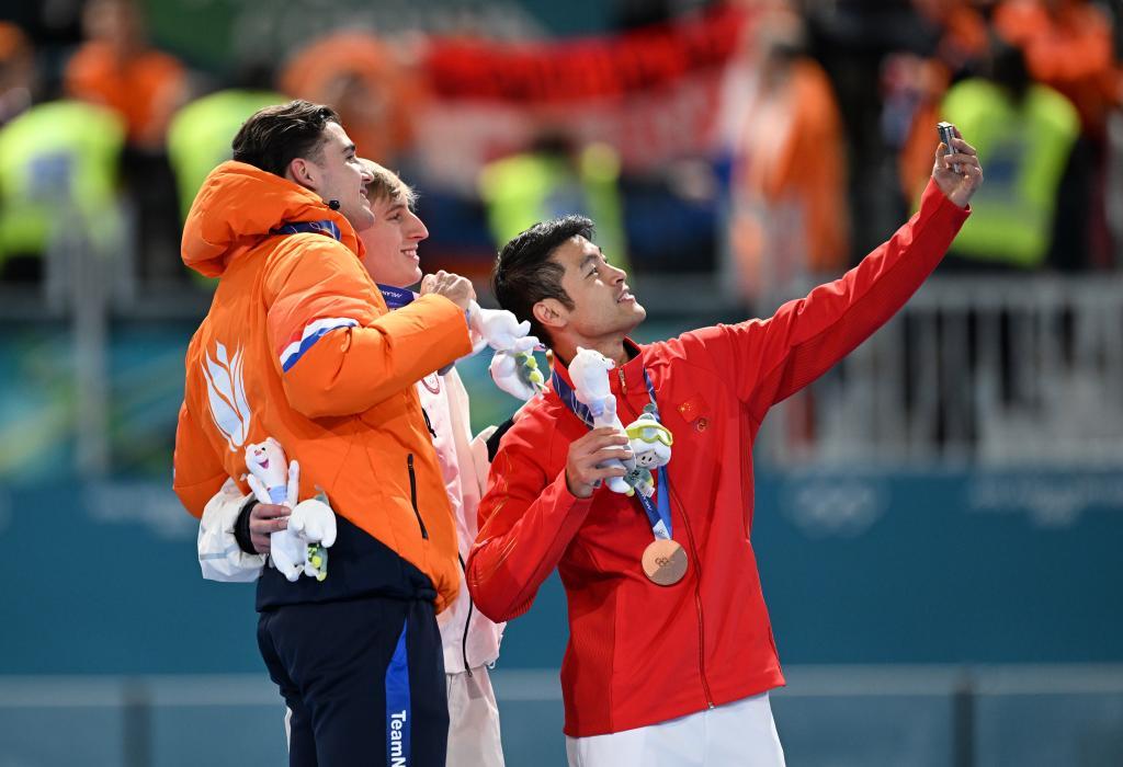 2月11日,冠军好意思国选手斯托尔兹(中)、亚军荷兰选手德布(左)和季军中国选手宁忠岩在授奖典礼上自拍。新华社记者 武巍 摄