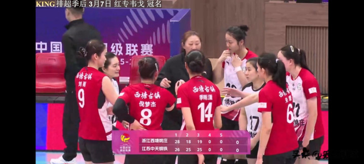 3月7日晚上体育录像/图片,北京时间19:30分,D组名次垫底的升班马浙江女排挑战名循序一的江苏女排,后果江苏中天钢铁女排客场3-1(26-28 25-18 25-19 25-21)逆转降服浙江西塘姚庄女排,卫冕冠军江苏女排获取季后赛四连胜积12分名次榜首,浙江女排四连败0分名次垫底。